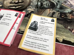 As students, we presented most of our research results in a multimodal way, so you can imagine it like this: I had a table displaying this board game, and visitors could sit down at the table. Once there were enough visitors, they could play the game and quiz each other using playing cards. Through this interaction, I, as the researcher, was able to learn more about my research and research question, and the visitors were able to learn more about Germany’s colonial heritage, providing them with food for thought. I also received a lot of positive feedback and identified areas for improvement in the game. It was a steep learning curve. Since Anna Szöke was also part of the seminar, I had the opportunity to display my game in the Room of the Benin Bronzes at the Ethnological Museum for a day. I went there on a Saturday and spent the whole day playing with people and talking to lots of visitors. It was a really good experience.